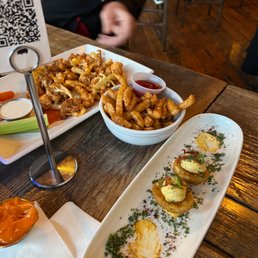 A couple friends and I joined here for the superbowl last weekend and it was a pretty good spot to hang out, overall. They had their all day Sunday happy hour going so we started off with some fried devilled eggs, wings, and cheese curds. Everything was pretty good! The cheese curd sauce was super lemony.. would've rather had a marinara, but it was nice to try something new. Once the game got further along we were getting hungry again and attempted to order the nachos on the menu. Unfortunately, they stopped serving the nachos, but it was still listed on the menu. Instead, we ordered the steak bites with fondue, buffalo cauliflower, and fish and chips. Everything was pretty good except the steak bites and fondue didn't live up to their expectations. The steak bites didn't have much flavor, nor did the fondue.. and it was kind of watery. That was a disappointment, but overall, service, even being busy on superbowl Sunday was good and all of the food mostly satisfied our cravings. We even got a burger patty for my dog and he loved it! The atmosphere was perfect for a chill afternoon/evening where you want to grab some bites and hang out or watch a sporting event. They had TVs all around the whole bar and the outside area was connected to the bar so I could bring my dog and still have a tv right in front of me to watch the game. I would recommend adding heaters above the seats at the outside bar or at least a couple that could be rolled over. They only had a few way in the back,l hear the street, but nowhere near the area we were sitting. It was a good time and would definitely consider coming back for a big game or Sunday Funday!